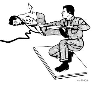 Figure 3-26.-Moving a victim away from an electrical line. Do not use, wear, or carry any object or material that might cause a spark. Matches, cigarette lighters, flashlights, candles or other open flames, and ordinary electrical lights must NEVER be taken into a compartment that may contain explosive vapors. The kind of portable light used by cleaning parties in boilers, fuel tanks, and similar places may be taken into a suspect compartment. This is a steam-tight, glove-type light whose exposed metal parts are either made of nonsparking alloy or protected in some way so they will not strike a spark. An electrical apparatus or tool that might spark must never be taken into a compartment until a DCO has indicated that it is safe to do so. When electrical equipment is used (e.g., an electric blower might be used to vent a compartment of explosive vapors), it must be explosion proof and properly grounded. If you go into a space that may contain explosive vapors, do not wear clothing that has any exposed spark-producing metal. For example, do not wear boots or shoes that have exposed nailheads or rivets, and do not wear coveralls or other garments that might scrape against metal and cause a spark. Aparticular caution must be made concerning the use of the steel-wire lifeline in compartments that may contain explosive vapors. If you use the line, be sure that it is carefully tended and properly grounded at all times. When other considerations permit, you should use a rope line instead of the steel-wire lifeline when entering compartments that may contain explosive vapors. RESCUE FROM THE WATER.-You should never attempt to swim to the rescue of a drowning person unless you have been trained in lifesaving methods-and then only if there is no better way of reaching the victim. Adrowning person may panic and fight against you so violently that you will be unable either to carry out the rescue or to save yourself. Even if you are not a trained lifesaver, however, you can help a drowning person by holding out a pole, oar, branch, or stick for the victim to catch hold of, or by throwing a lifeline or some buoyant object that will support the victim in the water. Various methods are used aboard ship to pick up survivors from the water. The methods used in any particular instance will depend upon weather conditions, the type of equipment available aboard the rescue vessel, the number of people available for rescue operations, the physical condition of the people requiring rescue, and other factors. In many cases it has been found that the best way to rescue a person from the water is to send out a properly trained and properly equipped swimmer with a lifeline. It is frequently difficult to get survivors up to the deck of the rescuing vessel, even after they have been brought alongside the vessel. Cargo nets are often used, but many survivors are unable to climb them without assistance. Persons equipped with lifelines (and, if necessary, dressed in anti-exposure suits) can be sent over the side to help survivors up the nets. If survivors are covered with oil, it may take the combined efforts of four or five people to get one survivor up the net. Aseriously injured person should never, except in an extreme emergency, be hauled out of the water by means of a rope or lifeline. Special methods must be devised to provide proper support, both to keep the victim in a horizontal position and to provide protection from any kind of jerking, bending, or twisting motion. The Stokes stretcher (described later in this chapter) can often be used to rescue an injured survivor. People on the deck of the ship can then bring the stretcher up by means of handlines. Life preservers, balsa wood, unicellular material, or other flotation gear can be used, if necessary, to keep the stretcher afloat. |