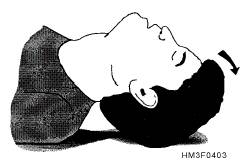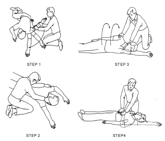Complete Airway Obstruction Conscious patients will attempt to speak but will be unable to do so. Nor will they be able to cough. Usually, patients will display the universal distress signal for choking by clutching their neck. The unconscious patient with a complete airway obstruction exhibits none of the usual signs of breathing: rise and fall of the chest and air exchange through the nose and/or mouth. A complete blockage is also indicated if a correctly executed attempt to perform artificial ventilation fails to instill air into the lungs. Opening the Airway POSITIONING THE PATIENT.3/4When a patient is unresponsive, you must determine if he is breathing. This assessment requires the patient to be positioned properly with the airway opened. Before repositioning patients, it is imperative that you remember to check them for possible spinal injuries. If there is no time to immobilize these injuries and the airway cannot be opened with the victim in the present position, then great care must be taken when repositioning. The head, neck, and back must be moved as a single unit. To do this, adhere to the following four steps (see figure 4-2). Step 1-Kneel to the side of the victim in line with the victim's shoulders, but far enough away so that the victim's body will not touch yours when it is rolled toward you. Straighten the victim's legs, gently but quickly. Then move the victim's closer arm along the floor until it reaches straight out past the head. Step 2-Support the back of the victim's head with one hand while you reach over with the other hand to grasp under the distant armpit. Step 3-Pull the patient toward you while at the same time keeping the head and neck in a natural straight line with the back. Resting the head on the extended arm will help you in this critical task. Step 4-Roll the patient onto his back and reposition the extended arm. Once the patient is supine with the arms alongside the body, you should position yourself at the patient's side. By positioning yourself at the patient's side, you can more easily assess whether the patient is breathing. If the patient is not breathing, you are already positioned to perform artificial respirations (also referred to as rescue breathing) and chest com- pressions. Either one of two maneuvers-the head tilt-chin lift maneuver or the jaw-thrust maneuver-may be used to open an obstructed airway. When performing these maneuvers, you may discover foreign material or vomitus in the mouth that needs to be removed. Do not spend very much time to perform this task. Liquids or semiliquids should be wiped out with the index and middle finger covered by a piece of cloth. Solid material should be extracted with a hooked index finger. HEAD TILT-CHIN LIFT MANEUVER.-The head tilt-chin lift maneuver is the primary method used to open the airway. To perform the head tilt-chin lift maneuver, place one of your hands on the patient's forehead and apply gentle, firm, backward pressure using the palm of your hand. Place the fingers of the other hand under the bony part of the chin. Lift the chin forward and support the jaw, helping to tilt the head back. See figure 4-3. This maneuver will lift the patient's tongue away from the back of the throat and provide an adequate airway. PRECAUTIONS: When performing the head tilt-chin lift maneuver, do not press too deeply into the soft tissue under the chin. Undue pressure in this location may obstruct the airway. In addition, make sure the mouth is kept open so exhalation and inhalation are not hindered. JAW-THRUST MANEUVER.-The jaw-thrust maneuver is considered an alternate method for opening the airway. This maneuver is accomplished by kneeling near the top of the victim's head, grasping the angles of the patient's lower jaw, and lifting with both hands, one on each side. This will displace the mandible (jawbone) forward while tilting the head backward. Figure 4-4 illustrates the jaw-thrust maneuver. If the lips close, retract the lower lip with your thumb. If mouth-to-mouth breathing is necessary, close the nostrils by placing your cheek tightly against them. NOTE: The jaw-trust technique without head tilt is considered the safest approach to opening the airway of patients with suspected neck injuries because it usually can be done without extending the neck. Figure 4-2.-The four steps to reposition the victims of spinal injuries.