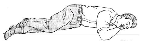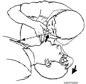 Figure 4-9.-Determining breathlessness. finger. Take a deep breath and seat your lips around the patient's mouth (creating an airtight seal), and give two slow ventilations (1 1/2 to 2 seconds per breath). See figure 4-11. Allow enough time for the lungs to deflate between ventilations. If the patient still does not respond, continue mouth-to-mouth ventilations at the rate of 10 to 12 ventilations per minute or one breath every 5 seconds. Periodically, check the pupils for reaction to light; constriction is a sign of adequate oxygenation. NOTE: When performing artificial ventilation and the lungs cannot be inflated adequately, repeat head tilt-chin lift or jaw-thrust maneuver, and again attempt ventilation. If the lungs still do not inflate adequately, assume the airway is obstructed by a foreign object. MOUTH-TO-NOSE.-Mouth-to-nose ventilation is effective when the patient's mouth cannot be opened (lockjaw), extensive facial or dental injuries occur, or an airtight seal of the mouth cannot be achieved. Figure 4-12 shows an example of this procedure. To administer this technique, tilt the head back with one hand on the patient's forehead and use the other hand to lift the jaw (as in the head tilt-chin lift maneuver). Close the victim's mouth. Take a deep breath, seal your lips around the patient's nose, and give two ventilations. Allow the victim's lungs to deflate passively after each ventilation. If the victim does not respond, then you must fully inflate the lungs at the rate of 10 to 12 ventilations per minute or one breath every 5 seconds until the victim can breathe spontaneously. MOUTH-TO-STOMA.-A casualty who has had surgery to remove part of the windpipe will breathe through an opening in the front of the neck called a stoma. Cover the casualty's mouth with your hand, take a deep breath, and seal your mouth over the stoma. Breathe slowly, using the procedures for mouth-to-mouth breathing. Do not tilt the head back. (In some situations, a person may breathe through the stoma as well as his nose and mouth. If the casualty's chest does not rise, cover his mouth and nose, and continue breathing through the stoma.) MOUTH-TO-MASK.-The mouth-to-mask breathing device includes a transparent mask with a one-way valve mouth piece. The one-way valve directs the rescuer's breath into the patient's airway while diverting the patients's exhaled air away from the rescuer. Some devices have an oxygen adaptor that permits the administration of supplemental oxygen. Figure 4-10.-A patient in the recovery position.