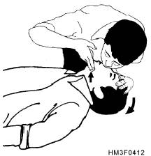 BREATHING The second aspect of basic life support is to restore breathing in cases of respiratory arrest. Failure of the breathing mechanism may be caused by various factors. They include complete airway obstruction, insufficient oxygen in the air, inability of the blood to carry oxygen (e.g., carbon monoxide poisoning), paralysis of the breathing center of the brain, and external compression of the body. Respiratory arrest is usually but not always immediately accompanied by cardiac arrest. Periodic checks of the carotid pulse must be made, and you must be prepared to start cardiopulmonary resuscitation (CPR). Signs of respiratory arrest are an absence of respiratory effort, a lack of detectable air movement through the nose or mouth, unconsciousness, and a cyanotic discoloration of the lips and nail beds. Determining Breathlessness Step 1 3/4 Place your ear over the patient's mouth and nose, while maintaining an open airway. Step 2 3/4 While observing the patient's chest, listen for air escaping during exhalation, and Recovery Position To place a patient in the recovery position, roll the patient onto his side so that the head, shoulders, and torso move simultaneously without twisting. If the patient has sustained trauma or trauma is suspected, the patient should NOT be moved. Artificial Ventilation Techniques of artificial ventilation include mouth-to-mouth, mouth-to-nose, mouth-to-stoma, and mouth-to-mask. These techniques as they apply to adult patients are discussed in the following sections. MOUTH-TO-MOUTH.-Artificial ventilation with the mouth-to-mouth technique is a quick, style="mso-spacerun: yes"> effective way to provide oxygen to the patient. The exhaled air contains enough oxygen to supply the patient's needs. To perform mouth-to-mouth ventilation, the airway must be open. To open the airway, perform the head tilt-chin lift or jaw-thrust maneuver. If there is no spontaneous breathing, start artificial ventilation by pinching the nose closed with your thumb and index