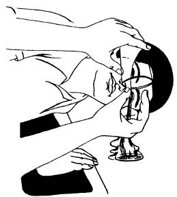 Figure 4-29.-Irrigating the eye. Facial Wounds Facial wounds that involve the eyelids or the soft tissue around the eye must be handled carefully to avoid further damage. If the injury does not involve the eyeball, apply a sterile compress and hold it in place with a firm bandage. If the eyeball appears to be injured, use a loose bandage. (Remember that you must NEVER attempt to remove any object that is embedded in the eyeball or that has penetrated it; just apply a dry, sterile compress to cover both eyes, and hold the compress in place with a loose bandage). Any person who has suffered a facial wound that involves the eye, the eyelids, or the tissues around the eye must receive medical attention as soon as possible. Be sure to keep the victim lying down. Use a stretcher for transport. |