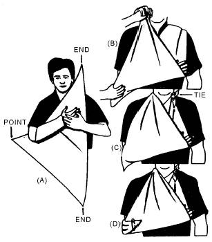 Apply a four-tailed bandage, as shown in figure 4-41. Be sure that the bandage pulls the lower jaw forward. Never apply a bandage that forces the jaw backward, since this might seriously interfere with breathing. The bandage must be firm so that it will support and immobilize the injured jaw, but it must not press against the victim's throat. Be sure that the victim has scissors or a knife to cut the bandage in case of vomiting. Treat the victim for shock and evacuate as soon as possible. |