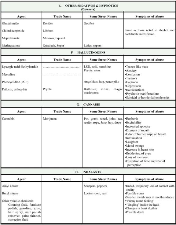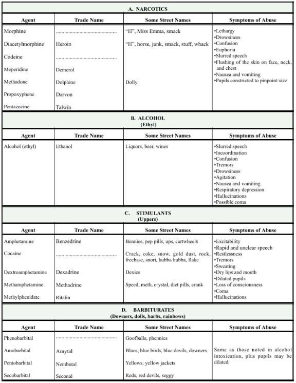 NARCOTIC INTOXICATION Unfortunately, narcotic abuse is common, although it is rare among military personnel. This group of drugs includes the most effective and widely used pain killers in existence. Prolonged use of narcotic drugs, even under medical supervision, inevitably leads to physical and psychological dependence. The more commonly known drugs within this group are opium, morphine, heroin, codeine, and methadone (a synthetic narcotic). In addition, Darvon 7 and Talwin7 are included in this group because of their narcotic-like action. Next to cocaine (discussed later), heroin is the most popular narcotic drug because of its intense euphoria and long-lasting effect. It is far more potent than morphine but has no legitimate use in the United States. Heroin appears as a white, gray, or tan fluffy powder. The most common method of using heroin is by injection directly into the vein, although it can be sniffed. Codeine, although milder than heroin and morphine, is sometimes abused as an ingredient in cough syrup preparations. Symptoms of narcotic drug abuse include slow, shallow breathing; possible unconsciousness; constriction (narrowing) of the pupils of the eyes to pinpoint size; drowsiness; confusion; and slurred speech. The narcotic user, suddenly withdrawn from drugs, may appear as a wildly disturbed person who is agitated, restless, and possibly hallucinating. Initial symptoms start within 2 to 48 hours and peak at about 72 hours. Although these signs and symptoms are not life-threatening, most users will state that they feel so bad they wish they were dead. The signs and symptoms of withdrawal immediately stop upon re-administering a narcotic and withdrawing the drug by tapering the dose over several days. ALCOHOL INTOXICATION Alcohol affects the body of the abuser in stages. Initially, there is a feeling of relaxation and well-being, followed by confusion with a gradual disruption of coordination, resulting in inability to accurately and efficiently perform normal activities and skills. Continued alcohol consumption leads to a stuporous state of inebriation that results in vomiting, an inability to walk or stand, and impaired consciousness (sleep or stupor). Excessive consumption can cause loss of consciousness, coma, and even-in extreme cases - death from alcohol poisoning. The potential for physical and psychological addiction is very high when alcohol is abused. The severely intoxicated individual must be closely monitored to avoid inhalation of vomit (aspiration) and adverse behavioral acts to the patient or others. Withdrawal from alcohol is considered to be life-threatening and should be appropriately treated in a healthcare facility. Individuals withdrawing from alcohol are at a greater risk of serious complications or death than those withdrawing from narcotics. The effects of alcohol withdrawal include severe agitation, anxiety, confusion, restlessness, sleep disturbances, sweating, profound depression, delirium tremens ("DTs," a particular type of confusion and shaking), hallucinations, and seizures. Table 5-6.-Classification of Abused Drugs Table 5-6.-Classification of Abused Drugs-Continued |