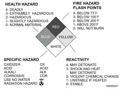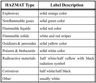 Table 5-7.-Hazardous Materials Warning Labels Red indicates the flammability. Protection Levels Level A -positive pressure-demand, full-face piece self-contained breathing apparatus (SCBA) or positive pressure-demand supplied air respirator with escape SCBA; fully encapsulating, chemical-resistant suit; inner chemical-resistant gloves; chemical-resistant safety boots/shoes; and two-way radio communication. Level B -positive pressure-demand, full-face piece SCBA or positive pressure-demand supplied air respirator with escape SCBA; chemical-resistant clothing (overalls and long-sleeved jacket with hooded one-or two-piece chemical splash suit or disposable chemical-resistant one-piece suit); chemical-resistant safety boots/shoes; hard hat; and two-way communication. Level C -full-face piece, air-purifying canister-equipped respirator; chemical-resistant clothing (overalls and long-sleeved jacket with hooded one-or two-piece chemical splash suit or disposable chemical-resistant one-piece suit); inner and outer chemical-resistant gloves; chemical-resistant safety boots/shoes; hard hat; and two-way communication. Level D -Coveralls, safety boots/shoes, safety glasses or chemical splash goggles, and hard hat. You are required to wear gloves at all four protection levels. If the correct type of glove to be used is not known, use neoprene or rubber, and avoid using latex or vinyl. In any instance, contact with HAZMAT should be avoided or minimized, and proper