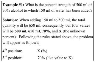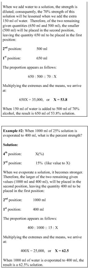 Ratio is the relationship of one quantity to another quantity of like value. Example ratios are 5:2, 4:1. These ratios are expressed as "5 to 2" and "4 to 1," respectively. Aratio can exist only between values of the same kind, as the ratio of percent to percent, grams to grams, dollars to dollars. In other words, the denominator must be constant. Proportion is two equal ratios considered simultaneously. An example proportion is 1:3::3:9 Terms of Proportion In a proportion, the product of the means equals the product of the extremes; therefore, when three terms are known, the fourth (or unknown) term may be determined. Application of Proportion In numbering the four positions of a proportion from left to right (i.e., first, second, third, and fourth, observe the following rules): Let X (the unknown value) always be in the fourth position. Let the unit of like value to X be the third position. Place the last value in the first position. When the proportion is correctly placed, multiply the extremes and the means and determine the value of X, the unknown quantity.