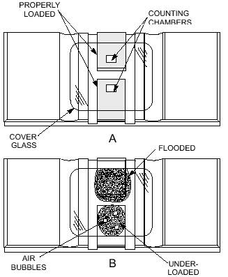 Figure 7-14.-Loading hemacytometer: A. Hemacytometer properly loaded; B. Hemacytometer improperly loaded.