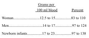 HEMOGLOBIN DETERMINATION A routine test performed on practically every patient is the hemoglobin determination. Hemoglobin determination, or hemoglobinometry, is the measurement of the concentration of hemoglobin in the blood. Hemoglobin's main function in the body is to carry oxygen from the lungs to the tissues and to assist in transporting carbon dioxide from the tissues to the lungs. The formation of hemoglobin takes place in the developing red cells located in bone marrow. Hemoglobin values are affected by age, sex, pregnancy, disease, and altitude. During pregnancy, gains in body fluids cause the red cells to become less concentrated, causing the red cell count to fall. Since hemoglobin is contained in red cells, the hemoglobin concentration also falls. Disease may also affect the values of hemoglobin. For example, iron deficiency anemia may drop hemoglobin values from a normal value of 14 grams per 100 milliliters to 7 grams per 100 milliliters. Above-normal hemoglobin values may occur when dehydration develops. Changes in altitude affect the oxygen content of the air and, therefore, also affect hemoglobin values. At higher altitudes there is less oxygen in the air, resulting in an increase in red cell counts and hemoglobin values. At lower altitudes there is more oxygen, resulting in a decrease in red cell counts and hemoglobin values.