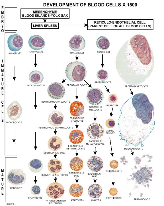 A total white blood cell count is not necessarily indicative of the severity of a disease, since some serious ailments may show a low white cell count. For this reason, a differential white cell count is performed. A differential white cell count consists of an examination of blood to determine the presence and the number of different types of white blood cells. This study often provides helpful information in determining the severity and extent of an infection, more than any other single procedure used in the examination of the blood. The role of white blood cells, or leukocytes, is to control various disease conditions. Although these cells do most of their work outside the circulatory system, they use the blood for transportation to sites of infection. Five types of white cells are normally found in the circulating blood. They are eosinophils, Cell Identification To acquaint you with the developmental stages of each type of leukocyte, a colorized illustration (fig. 7-17) has been provided. This illustration also displays the developmental stages of the red blood cell (erythrocyte) and the blood platelet cell (thrombocyte). To further assist you, identifying characteristics of each type of leukocyte as they appear on a stained blood smear will be covered in the following sections. Laboratories use a blood smear to obtain a differential white cell count. To prepare a blood smear, a blood specimen is spread across a glass slide, stained to enhance leukocyte identification, and examined microscopically. Material requirements and the step-by-step procedure for performing a blood smear will be covered later in this chapter. NEUTROPHILS.-Neutrophils account for the largest percentage of leukocytes found in a normal blood sample, and function by ingesting invading bacteria. On a stained blood smear, the cytoplasm of a neutrophil has numerous fine, barely visible lilac-colored granules and a dark purple or reddish purple nucleus (see figure 7-17). The nucleus may be oval, horseshoe, or "S"-shaped, or segmented (lobulated). Neutrophils are subclassified according to their age or maturity, which is indicated by changes in the nucleus. The subclassifications for neutrophilic cells are metamyelocyte, band, segmented, and hypersegmented. Neutrophilic Metamyelocyte.-A neutrophilic metamyelocyte, also called a "juvenile" cell, is the youngest neutrophil generally reported. The nucleus is fat, indented, and is usually "bean"-shaped or "cashew nut"-shaped (fig. 7-17). Neutrophilic Band.-A neutrophilic band, sometimes called a "stab" cell, is an older or intermediate neutrophil. The nucleus has started to elongate and has curved itself into a horseshoe or S-shape. As the band ages, it matures into a segmented neutrophil (fig. 7-17). Segmented Neutrophil.-A segmented neutrophil is a mature neutrophil. The nucleus of a segmented neutrophil is separated into two, three, four, or five segments or lobes (fig. 7-17). EOSINOPHIL.-Eosinophils aid in detoxification. They also break down and remove protein material. The cytoplasm of an eosinophil contains numerous coarse, reddish-orange granules, which are lighter colored than the nucleus (fig. 7-17). BASOPHIL.-The function of basophilic cells is unknown. It is believed, however, that basophilic cells keep the blood from clotting in inflamed tissue. Scattered large, dark-blue granules that are darker than the nucleus, characterize the cell as a basophil (fig. 7-17). Granules may overlay the nucleus as well as the cytoplasm. LYMPHOCYTE.-The function of lymphocytes is also unknown, but it is believed that they produce antibodies and destroy the toxic products of protein metabolism. The cytoplasm of a lymphocyte is clear sky blue, scanty, with few unevenly distributed, azurophilic granules with a halo around them (fig. 7-17). The nucleus is generally round, oval, or slightly indented, and the chromatin (a network of fibers within the nucleus) is lumpy and condensed at the periphery. MONOCYTE.-The monocyte, the largest of the normal white blood cells, destroys bacteria, foreign particles, and protozoa. Its color resembles that of a lymphocyte, but its cytoplasm is a muddy gray-blue (fig. 7-17). The nucleus is lobulated, deeply indented or horseshoe-shaped, and has a relatively fine chromatin structure. Occasionally, the cytoplasm is more abundant than in the lymphocyte. |