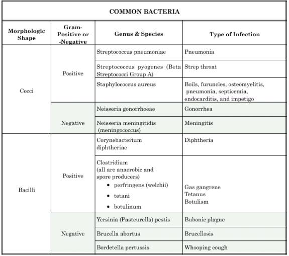 Table 7-3.-Common Bacteria 1. Spread the specimen with a wood applicator stick across a slide that has been cleaned with alcohol or acetone and polished with lens paper. The smear should be thin and uniformly spread. If the smear is opaque, it is too thick and should be emulsified with a drop or two of saline. 2. Label the smear and circle the material to be stained with a diamond point pen for easier identification and location of the material after staining. 3. Let the smear air dry. Do not use forced heat drying; forced drying will distort bacterial cells and other materials. 4. Hold the smear with forceps and fix the smear by passing it through a flame (smear side up) three or four times. Avoid overheating the smear; overheating will cause cellular wall destruction. 5. Let the slide cool. Once the slide is cooled, it is ready to be stained. |