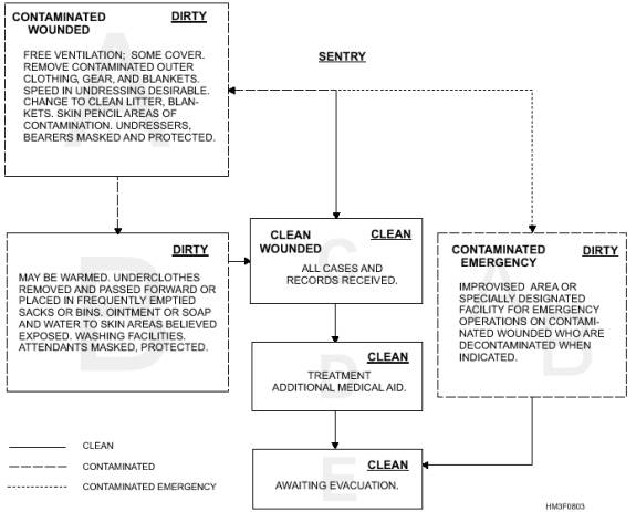 DECONTAMINATION The guiding principle in personnel decontamination is to avoid spreading contamination to clean areas and to manage casualties without aggravating other injuries. Casualty Priorities The following order of priority for first aid and decontaminating casualties is recommended: 1. Control of massive hemorrhage 5. Adjustment of patient's mask, if mask is necessary 6. First aid in less severe shock and wounds The basic steps in sorting and handling casualties are indicated in figure 8-3. This plan should be modified to fit specific needs.