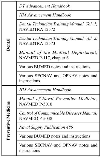 CHATER 10 EMERGENCY DENTAL CARE AND PREVENTIVE MEDICINE TERMINALOBJECTIVE: Be familiar with the subject matter and technical publications relating to emergency dental care and preventive medicine. Because of the nature of our rating and the many responsibilities placed upon us, Hospital Corpsmen must have a general understanding of many areas of medicine. Emergency dental care and preventive medicine practices are two of those areas. Both of these subjects are extremely important, but because they are both already discussed in great detail in other Navy publications, this chapter will present only a brief overview of them. Emergency Dental Care is covered in Section I, and Preventive Medicine is addressed in Section II. For in-depth information, refer to the publications outlined respectively in table 10-1. SECTION I The primary function of this emergency dental care is to alleviate pain, arrest hemorrhage, or prevent further or complicating injury to dental structures. Ensuring that the entire crew is in good dental health before deployment will prevent most dental-related problems. Therefore, predeployment examinations are very important. You must administer only emergency dental care. Refer routine cases to a dental treatment facility, and refer any cases treated by nondental personnel for follow-up at the earliest opportunity. DENTAL ANATOMY AND HISTOLOGY Dental Dental Technician Training Manual, Vol. 2, NAVEDTRA 12573 Manual of the Medical Department, NAVMED P-117, chapter 6 Various BUMED notes and instructions Preventive Medicine HM Advancement Handbook Manual of Naval Preventive Medicine, NAVMED P-5010 Control of Communicable Diseases Manual, Naval Supply Publication 486 Various BUMED notes and instructions Various SECNAV and OPNAV notes and instructions Table 10-1.-Publication List