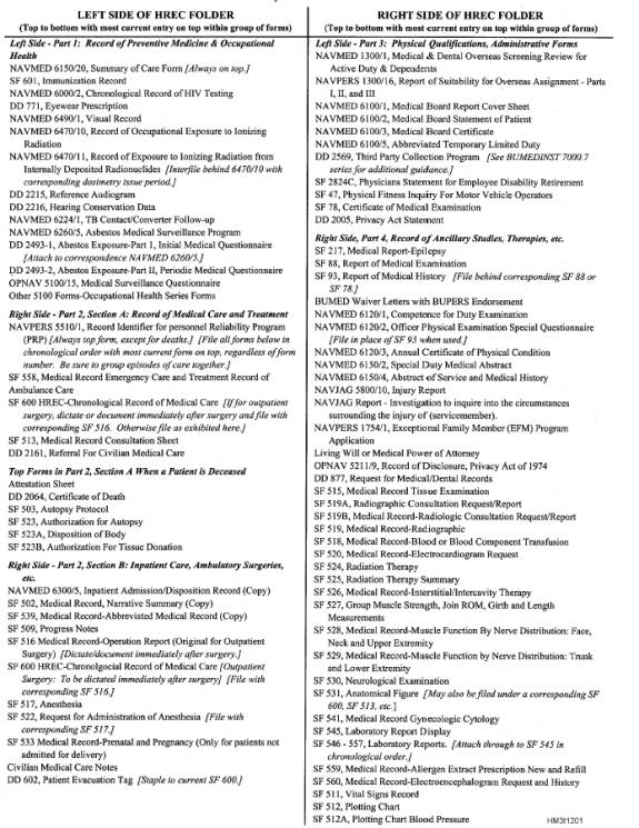 SEQUENCE OF HEALTH RECORD FORMS When assembling an HREC, you should arrange the forms in chronological order by date. The most current document should be placed on top, and the least current documents below it. The HREC contains dividers that partition the record into four parts. A sequential listing of medical forms to be filed in each section is provided in table 12-1. The titles for each part of the HREC are as follows: Part 1. Record of Preventive Medicine and Occupational Health Part 2. Record of Medical Care and Treatment Part 3. Physical Qualifications HEALTH RECORD FORMS LEARNING OBJECTIVE: Recall the purpose and completion procedures for the health record forms discussed in this section. In the last section, you learned there are many medical forms placed in the health record. Also, you learned each form has a specific location within the record. The methods for the management of major areas of health care, both ashore and afloat, are rapidly changing. The Composite Health Care System (CHCS), a secure, computer-based system, is now the primary means that healthcare practitioners use to schedule and process patient visits, track medical results, order labs and x-rays, and process orders for medications. CHCS is especially valuable for pier-side healthcare providers and furnishes a much higher standard for patient care. Computerized medical documentation (e.g., laboratory test results, emergency room reports, etc.) has become commonplace. However, the Navy Medical Department continues to use many government printed forms (e.g., NAVMED, DD, and SF). This section will cover selected (government- printed) medical forms, their purpose, and procedures for completing them. Table 12-1.-Sequential List of Health Record Forms