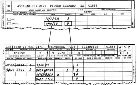 Figure 13-7.-Posting inventory to stock records Location High limit, low limit, and safety level quantities are computed in accordance with NAVSUP P-485 and recorded on the NAVSUP 1114. Allowance List Quantity (A/L QTY) Allowance Type Code (AT) E/R/C Codes BEG.MO.DE. Demand Frequency Brought Forward (DFBF) URG MRT Economic Order Item (EOI) Critical Item (CI) Military Essentiality Code (MEC) Security Classification Code (SCC) Shelf-Life Code (SLC) Requisition Outstanding |