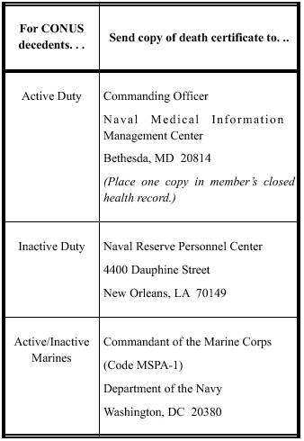 LEARNING OBJECTIVE: Determine when civil certificates are required and where they should be distributed. A civil certificate of death must be obtained if a death occurs within one of the 50 United States or the District of Columbia. If a death occurs outside these areas, with the exception of Guam, a Certificate of Death (Overseas), DD 2064, should be prepared. This certificate is in addition to the civil certificate of death; however, the civil certificate of death is not required in all overseas areas. Civil authorities should be consulted to determine local requirements. When a death occurs at a naval activity in any state, territory, or insular possession of the United States, the CO will report the death to civil authorities (usually the coroner or medical examiner). It is a general practice for medical officers to complete a civil certificate of death for all deaths occurring in naval medical treatment facilities. The medical officer or Medical Department representative of the ship or station where the deceased was attached will obtain the certificate from the civil authorities. If requested by the authorities, the civil certificate of death may be prepared and signed by a naval officer. If problems arise in getting a certificate, request assistance from MEDDEN Affairs. If death occurs abroad and no naval activity is available, the nearest consular officer should be requested to get a certificate. The medical officer or Medical Department representative will prepare and forward a DD 2064 with the civil certificate of death, supporting papers, and the closed health record. In general (except where the state has retained concurrent jurisdiction with the United States, civil authorities have no jurisdiction over deaths occurring on naval reservations. However, a transit or burial permit should be obtained from civil authorities to remove the remains from a naval reservation either for shipment or burial. If death of any person for whomthe Department of the Navy is responsible occurs outside the limits of a naval reservation, the remains normally will not be moved until permission has been received from civil authorities. DISTRIBUTION OF DEATH CERTIFICATE FOR DEATHS OCCURRING IN CONUS When a Navy or Marine Corps death occurs in one of the 50 United States or the District of Columbia, follow local civil requirements. In addition, the following procedures in table 16-1 apply: DISTRIBUTION OF DEATH CERTIFICATE FOR DEATHS OCCURRING OUTSIDE CONUS When a Navy or Marine Corps death occurs outside the 50 United States or the District of Columbia, follow the local civil requirements. In For CONUS decedents. . . Send copy of death certificate to. ..